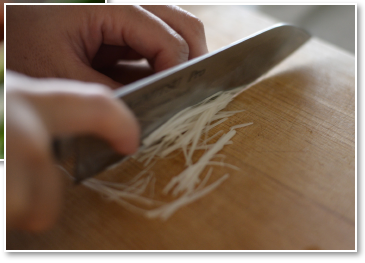 剥いていき、薄皮を剥いで千切りにします。