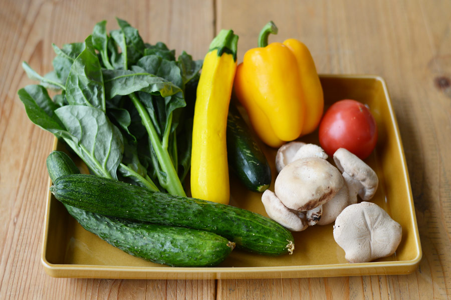 旬のツルムラサキやズッキーニ、きゅうりにトマト。