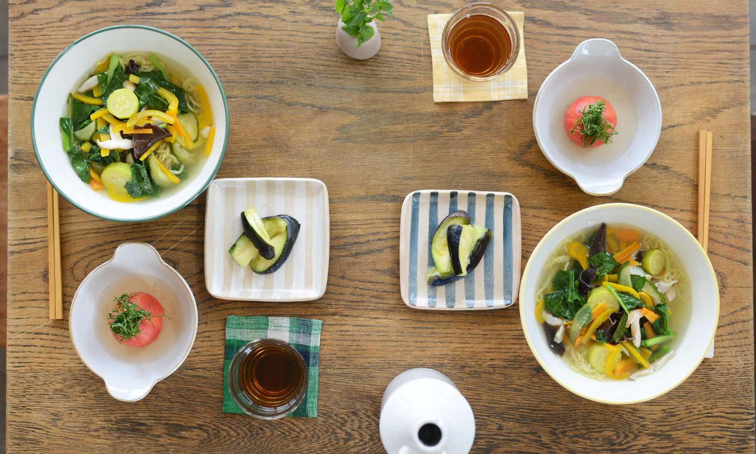 品数が少ない分、ボーダー柄の器を加えてにぎやかな雰囲気に。