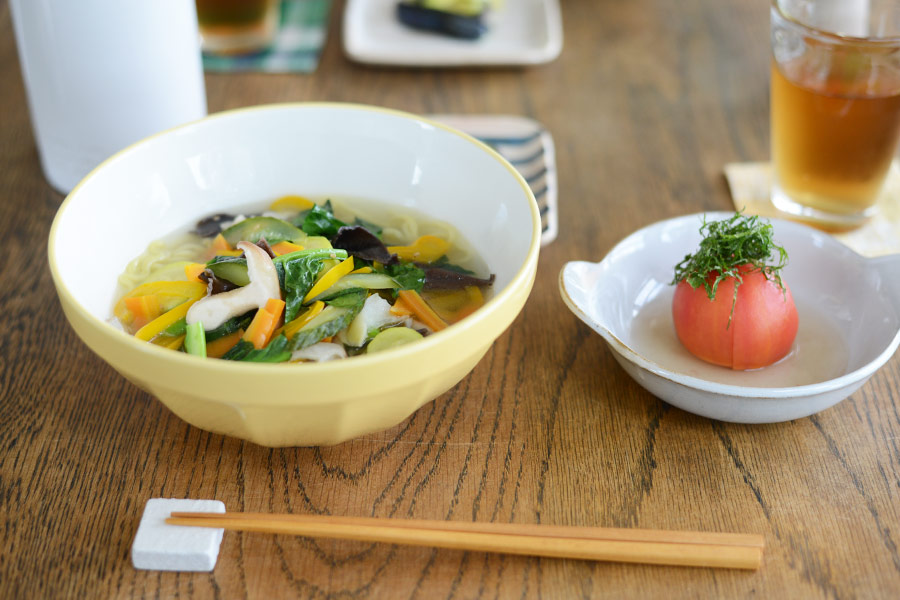 取っ手の形がポイントの器は、汁気の有無に関わらず使いやすい。