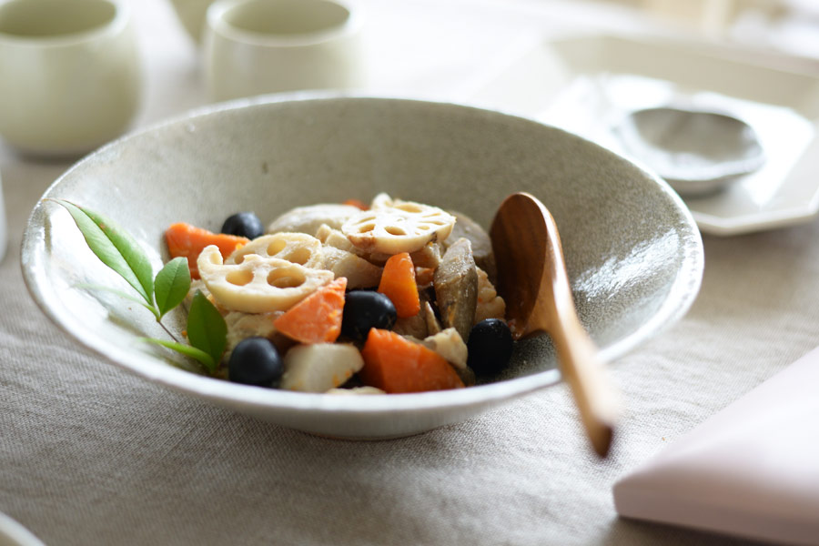 里芋や大根など根菜を入れたお雑煮は、土や釉薬の表情豊かなボウルに。