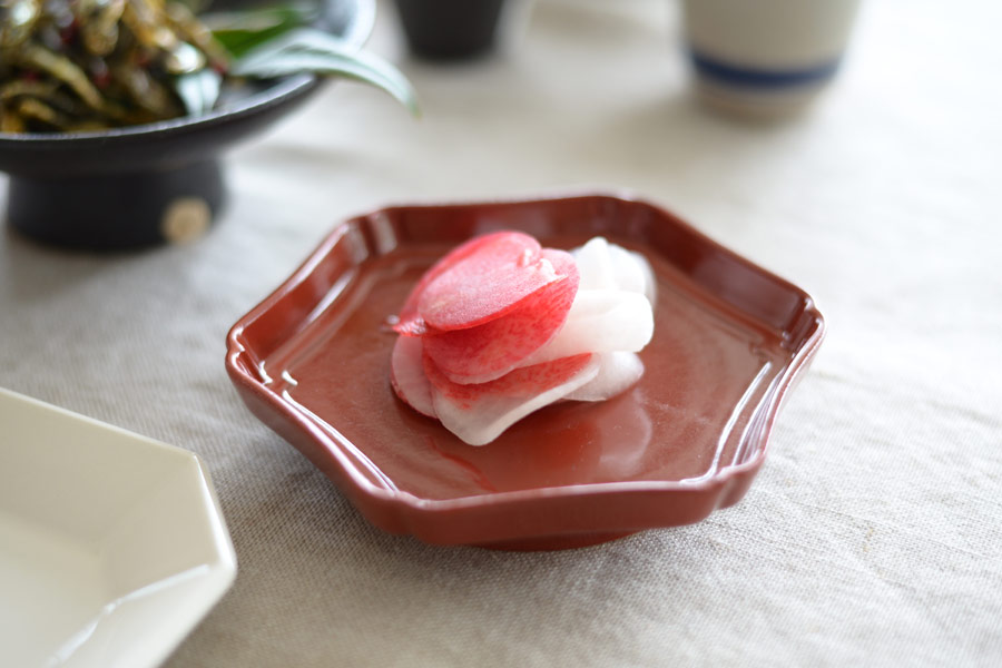 紅白2色の大根を使ったマリネは、椿の花をかたどったお皿に。