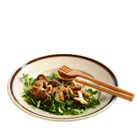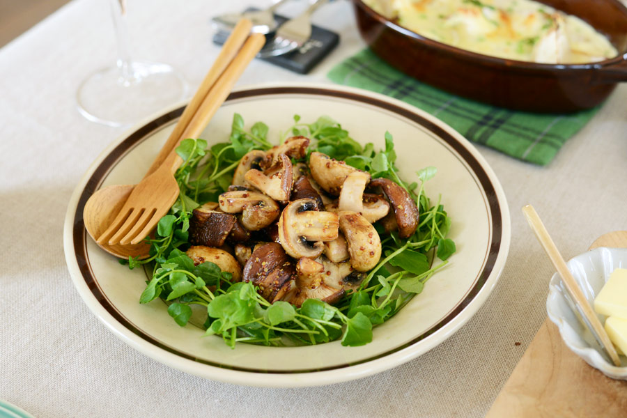 炒めた肉厚なマッシュルームとしいたけを、赤ワインビネガーとマスタード、しょうゆで味つけ。
