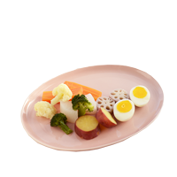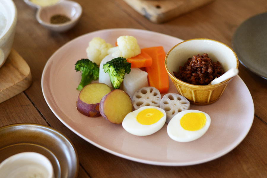やさしいピンクの色合いが、素朴な根菜をおいしそうにみせてくれる。
