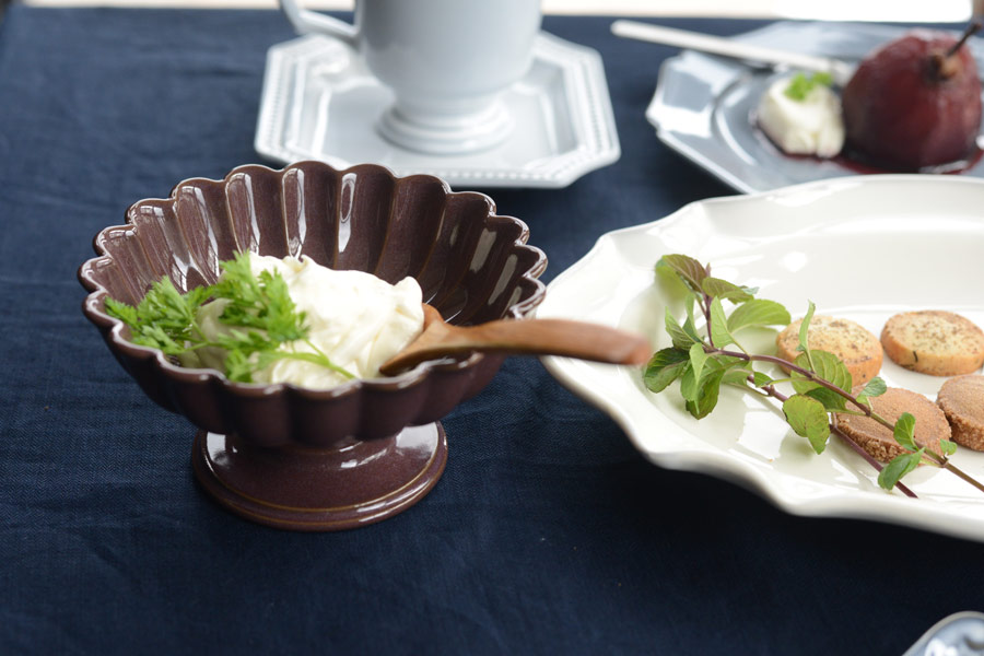 大人っぽいモーヴ色のコンポートに生クリームを盛りつけて。