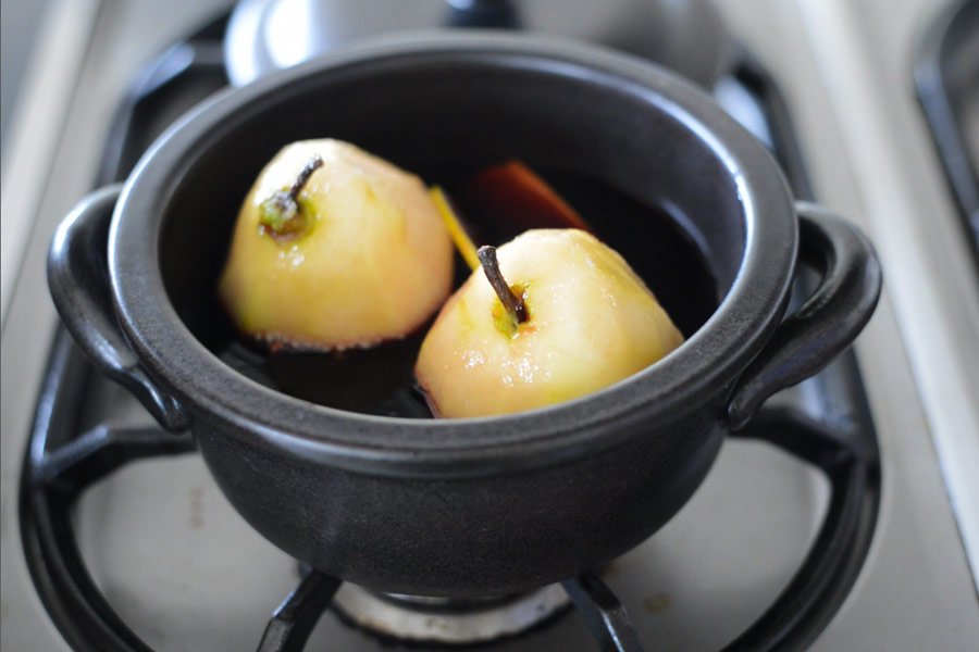 洋梨が2個ちょうどおさまるサイズの土鍋でコトコト煮込む。