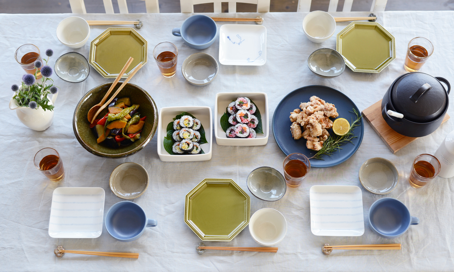 淡い水色のリネンのクロスや染付の取皿など、爽やかな色合いのものを中心に