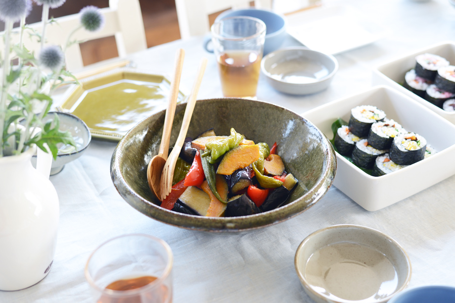秋の始まりも少し意識して、深みのあるグリーンやグレーの器をプラス。