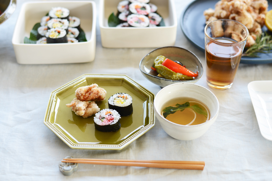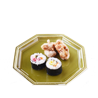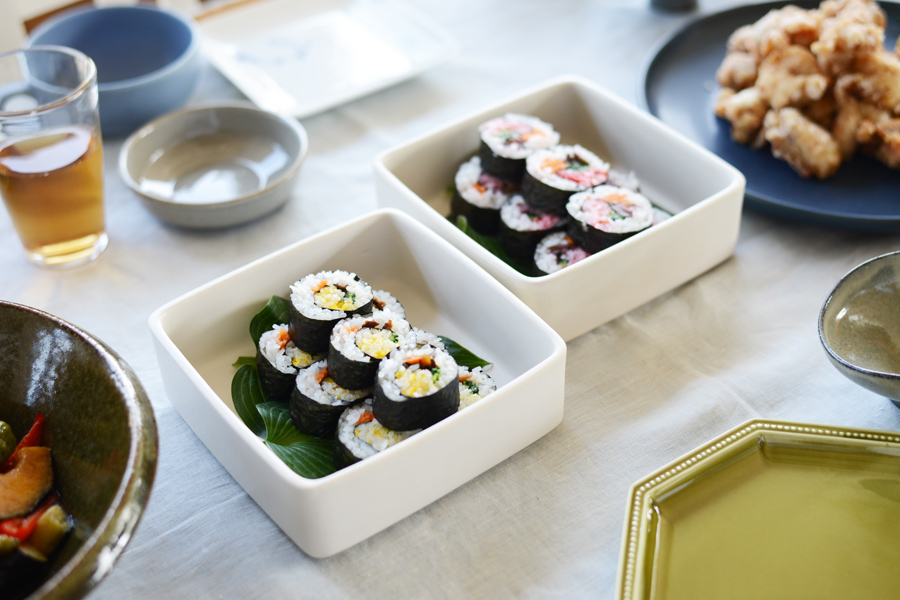 梅や卵で酢飯を色づけして、可愛らしく仕上げたのり巻き。