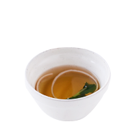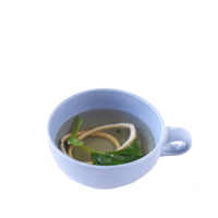 取っ手のついた優しいブルーのスープカップに、庄内麩とみつ葉のお吸い物をよそって。