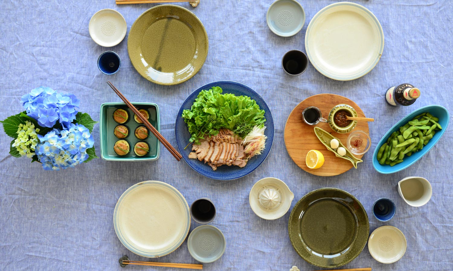 器もあじさいの色とイメージから、ちょっと和の雰囲気があって清涼感のある色のものをセレクト。