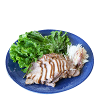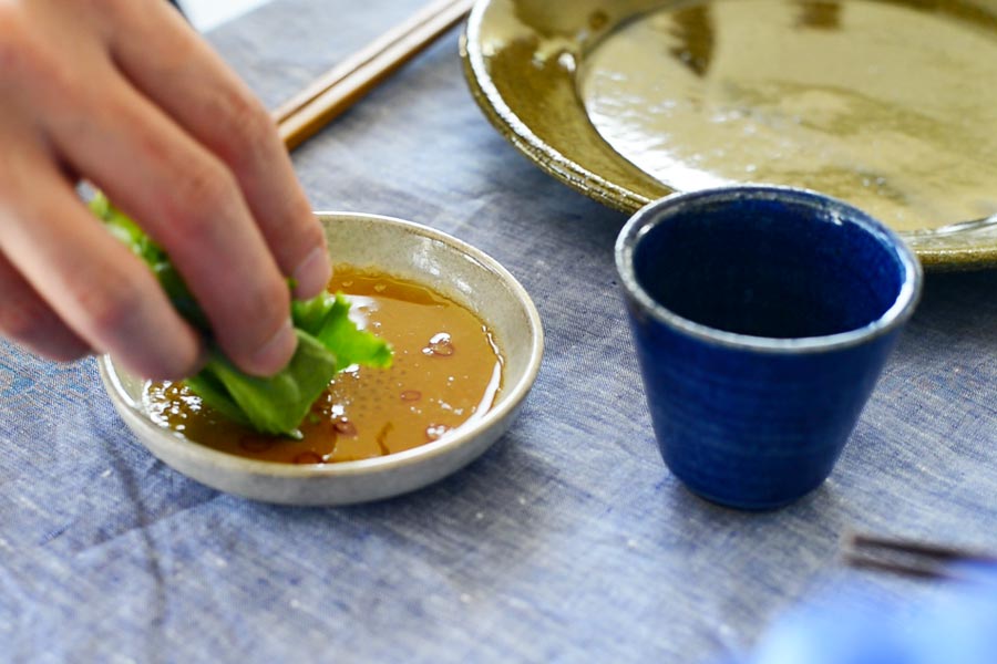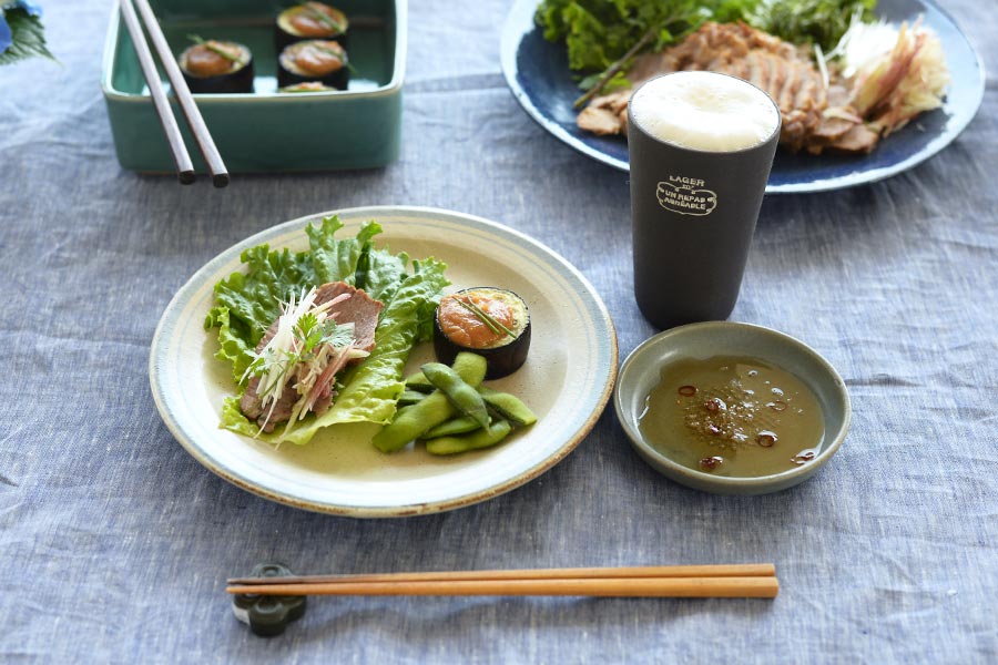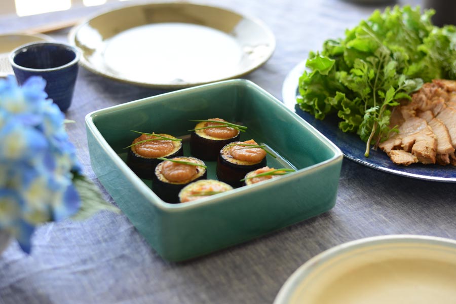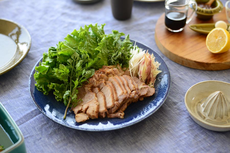 メインの煮豚は深い藍色の刷毛目が涼しげなプレートに盛りつけて。