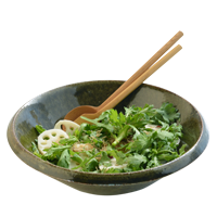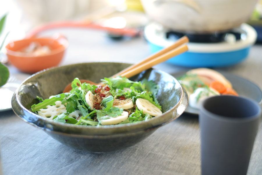 深みのあるグリーンが存在感のあるボウルにたっぷり盛りつけて。