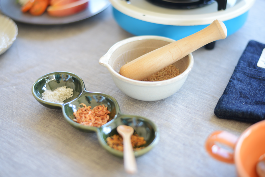 今日の薬味は干しエビに七味、おいしい粗塩、ごまを用意。
