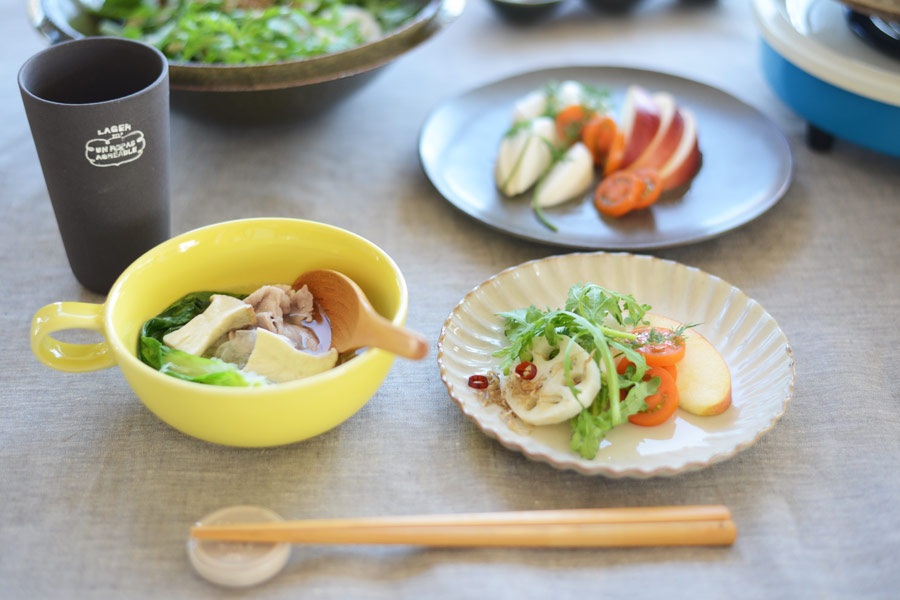 程よく深さがある大皿はかさばる野菜も盛れて、テーブルの上もすっきりまとまる。