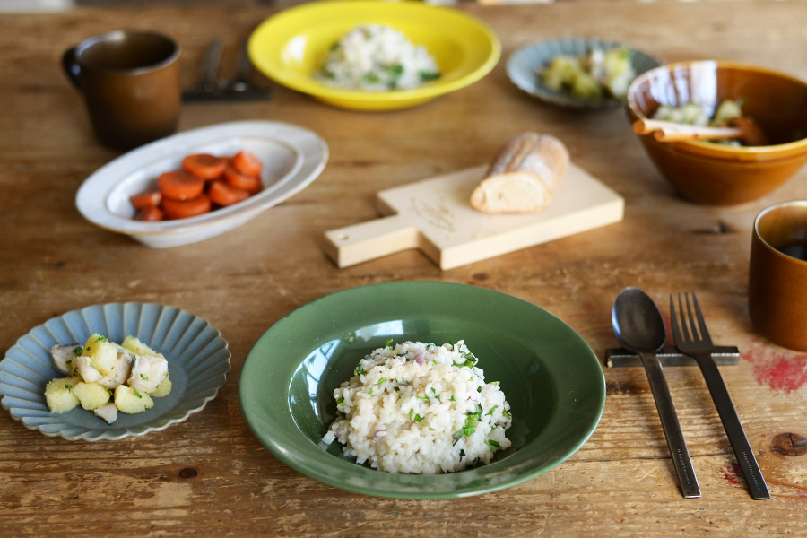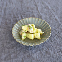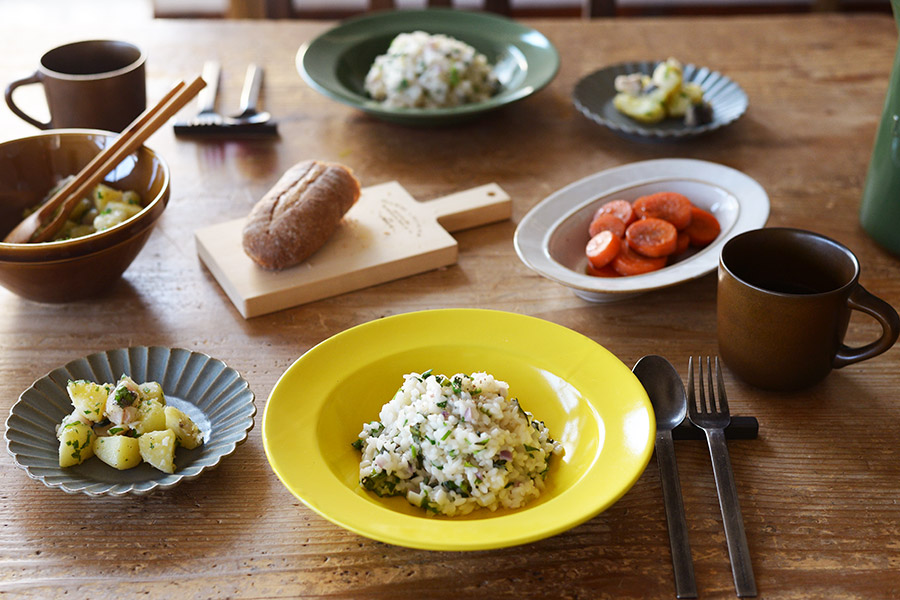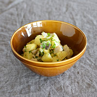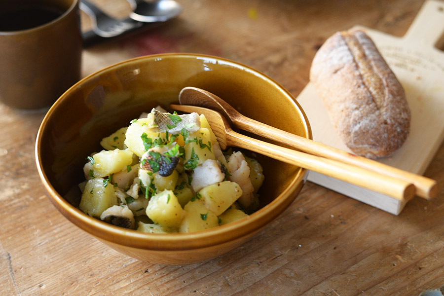 アメ色のシンプルなボウルにはタラとじゃがいもの温かいサラダを。