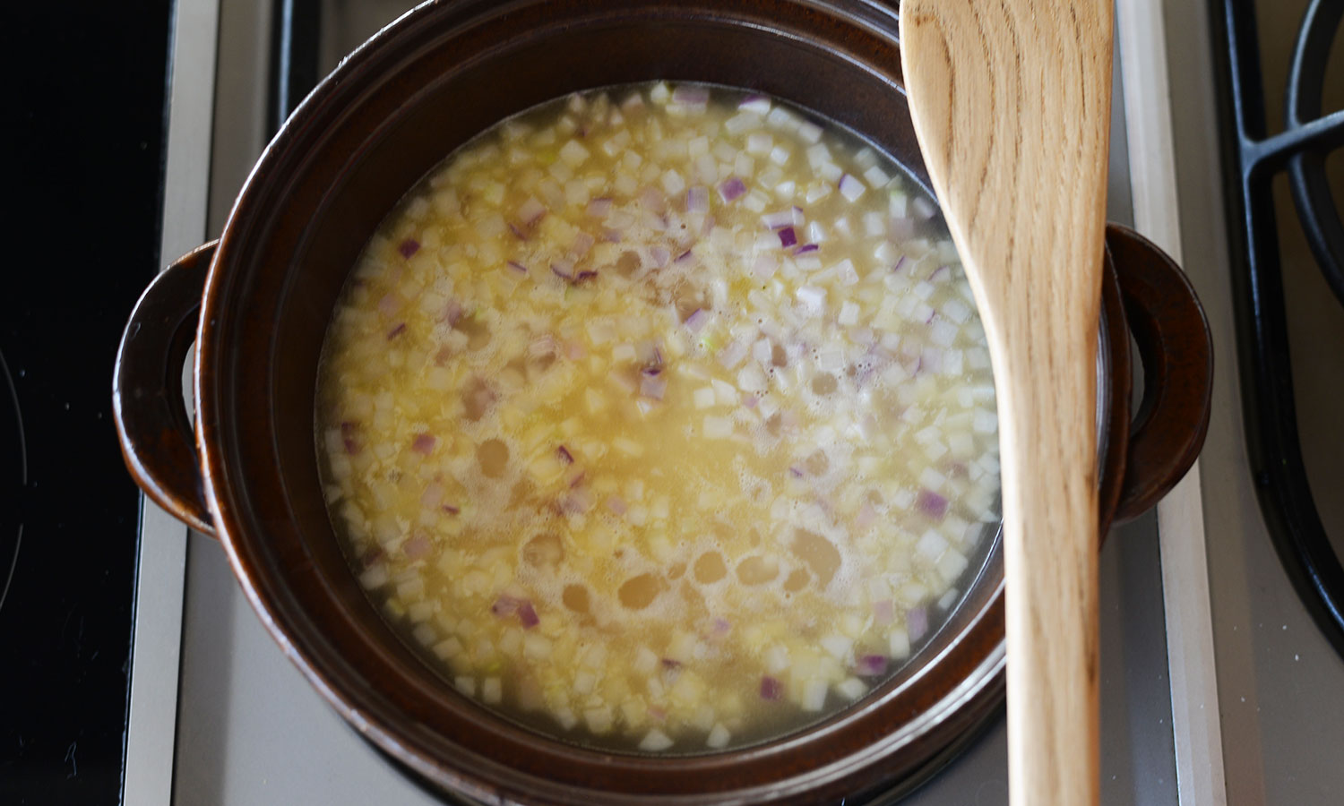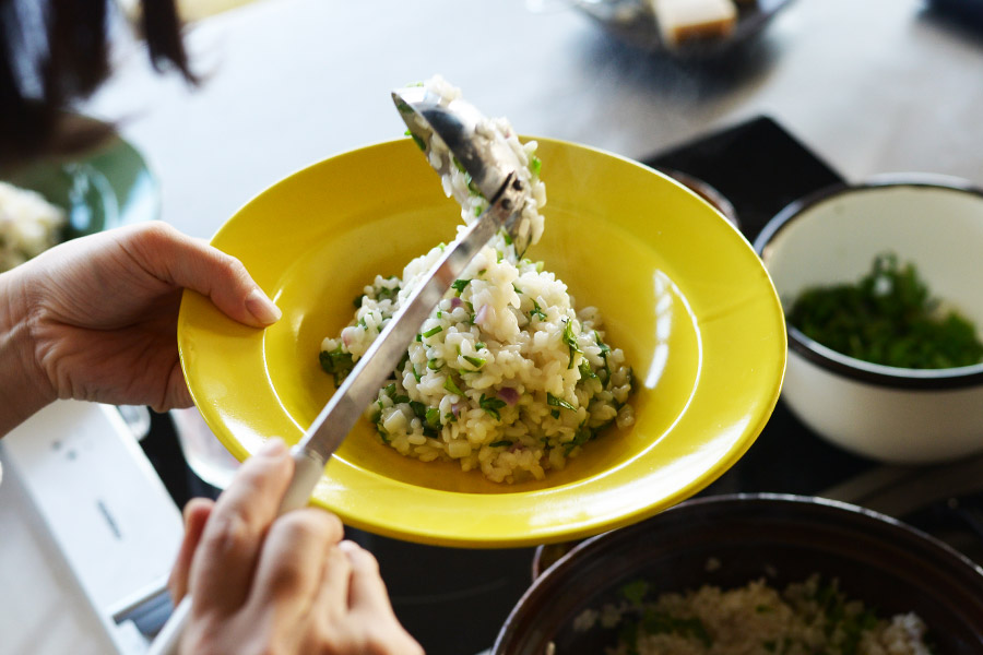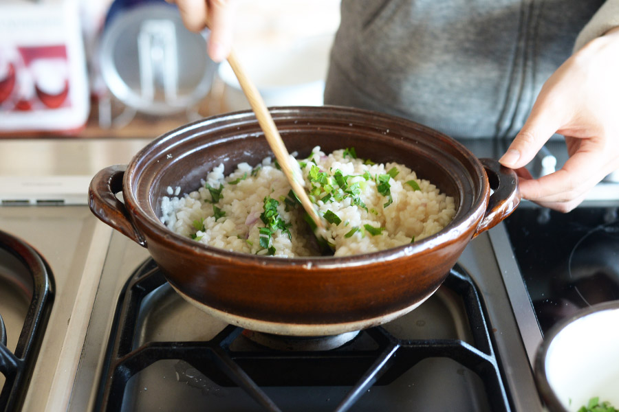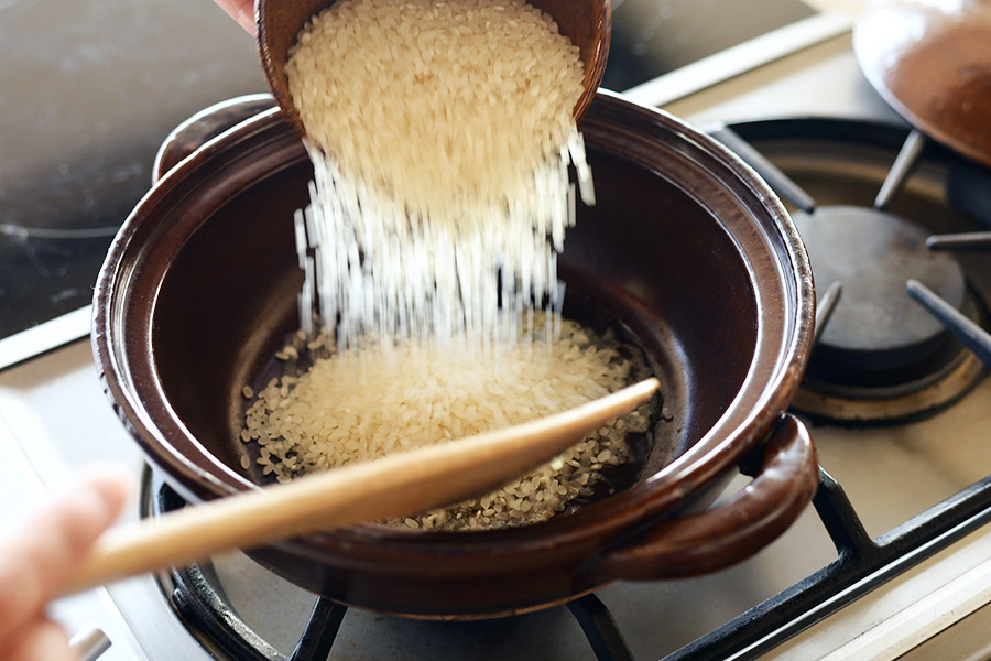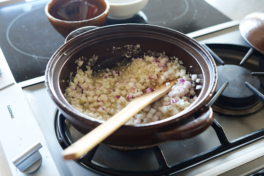 リゾットは土鍋を使って生米を炒めるところから作ります。