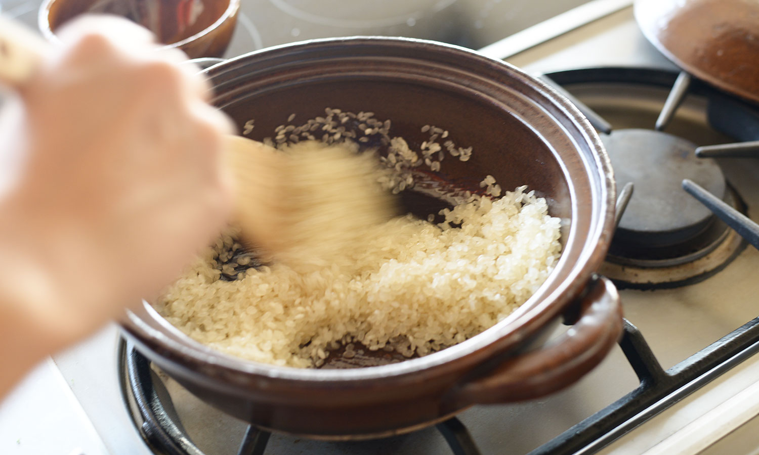少し浅めの土鍋は、底が平らなので生米も炒めやすい。