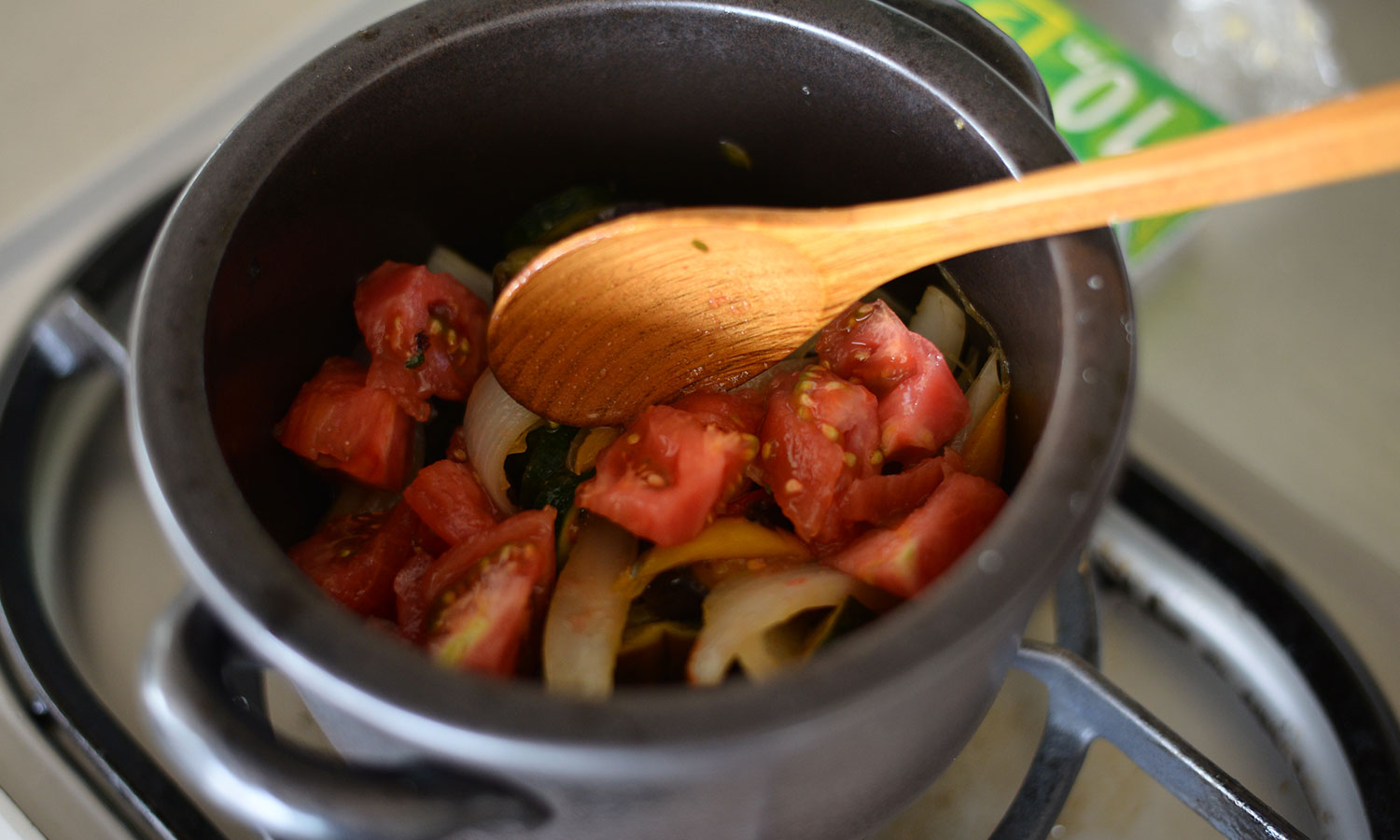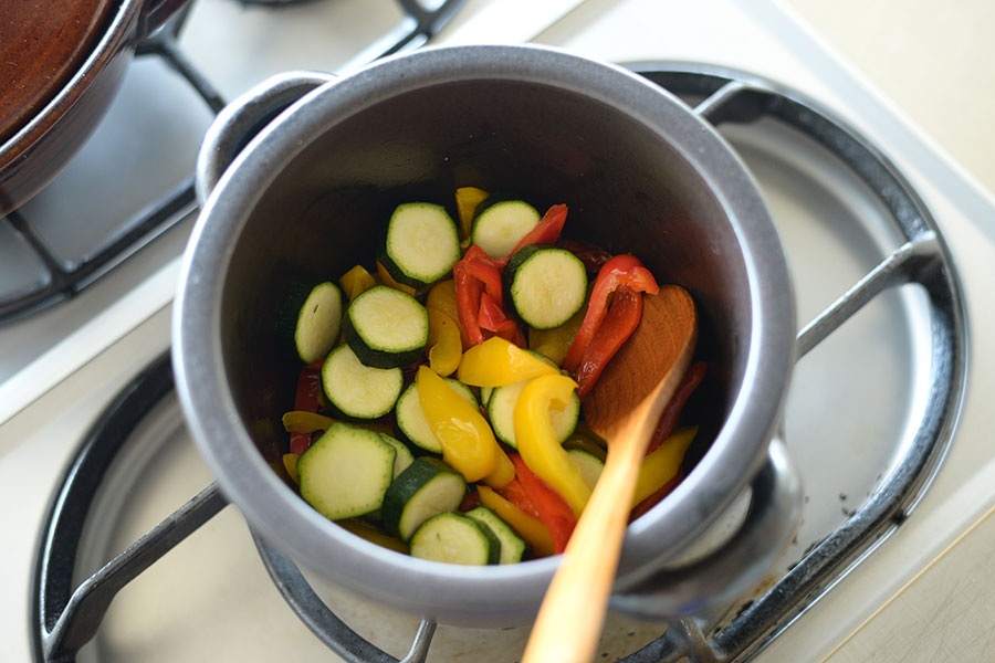 素材そのものの水分を生かして蒸し煮にしていくラタトゥイユ。