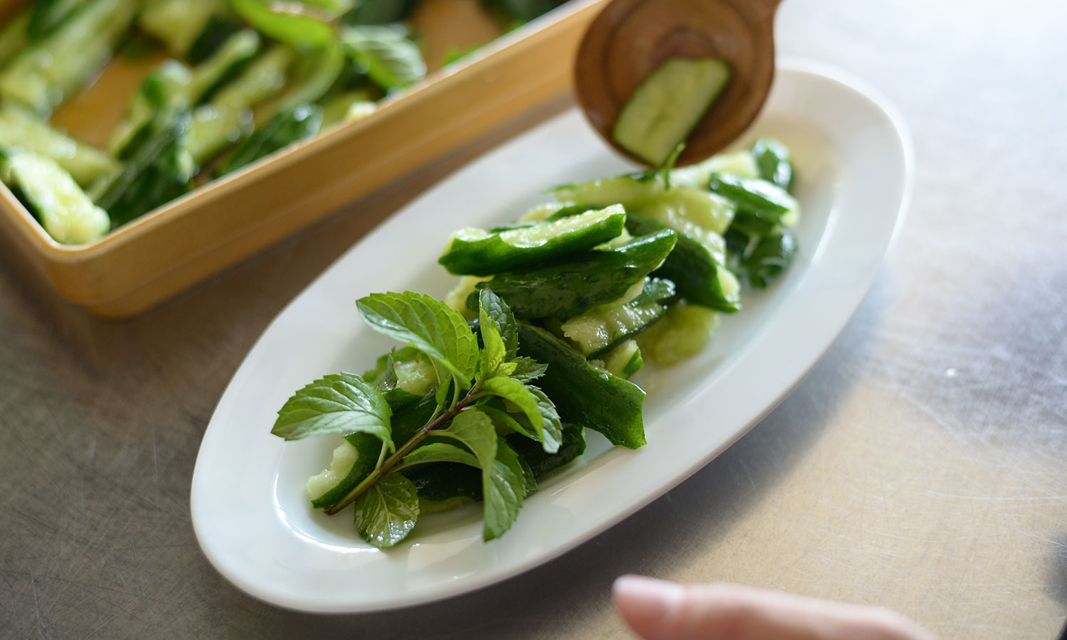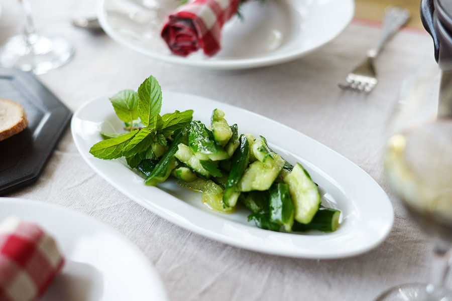 ミントやにんにくの風味で味をひきしめたきゅうりのサラダ。