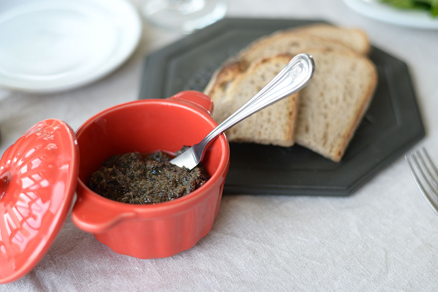 スライスしたカンパーニュに黒オリーブをたっぷり入れたタプナードをつけて。