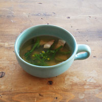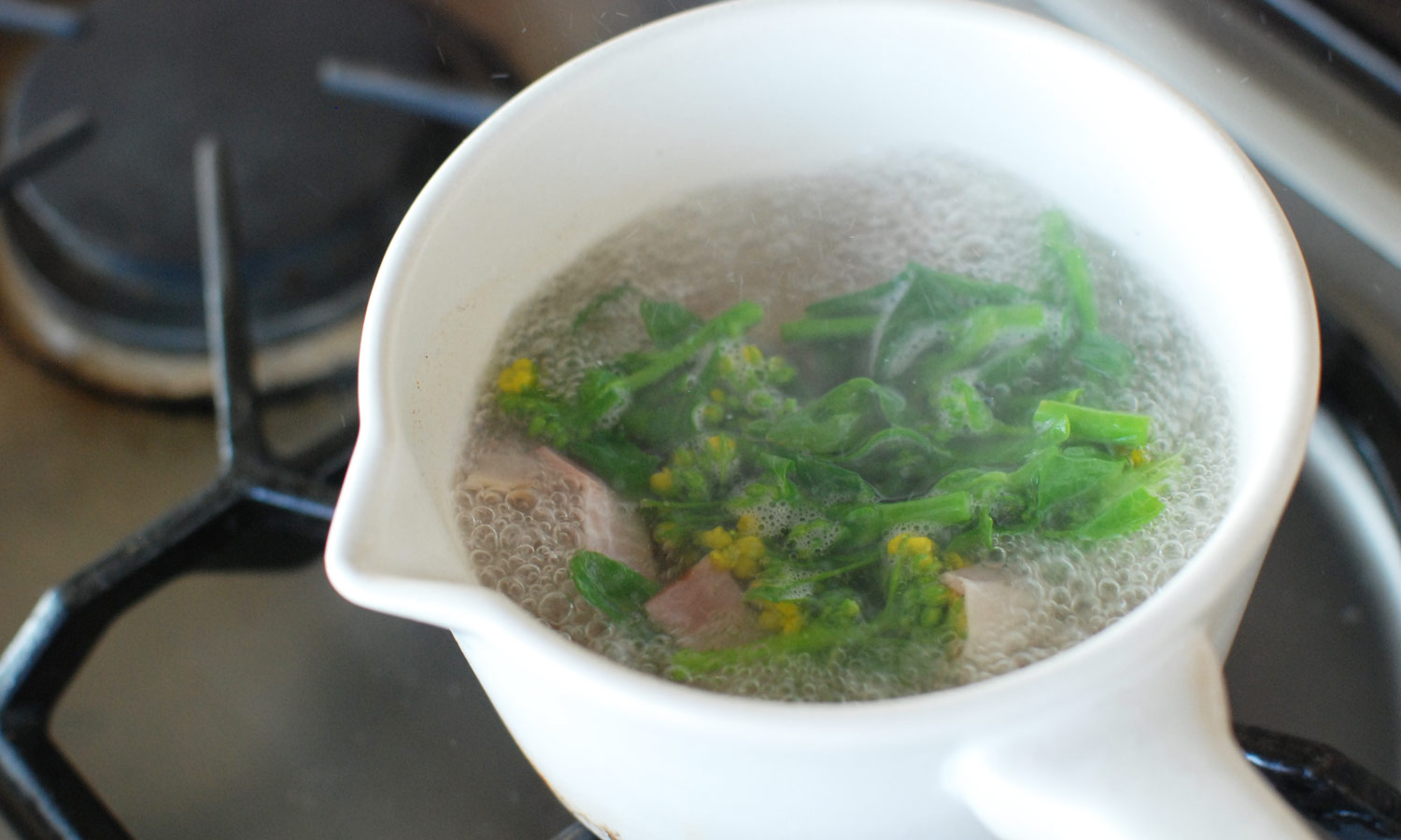 春らしい黄色の蕾がついたアスパラ菜とベーコンのお味噌汁。