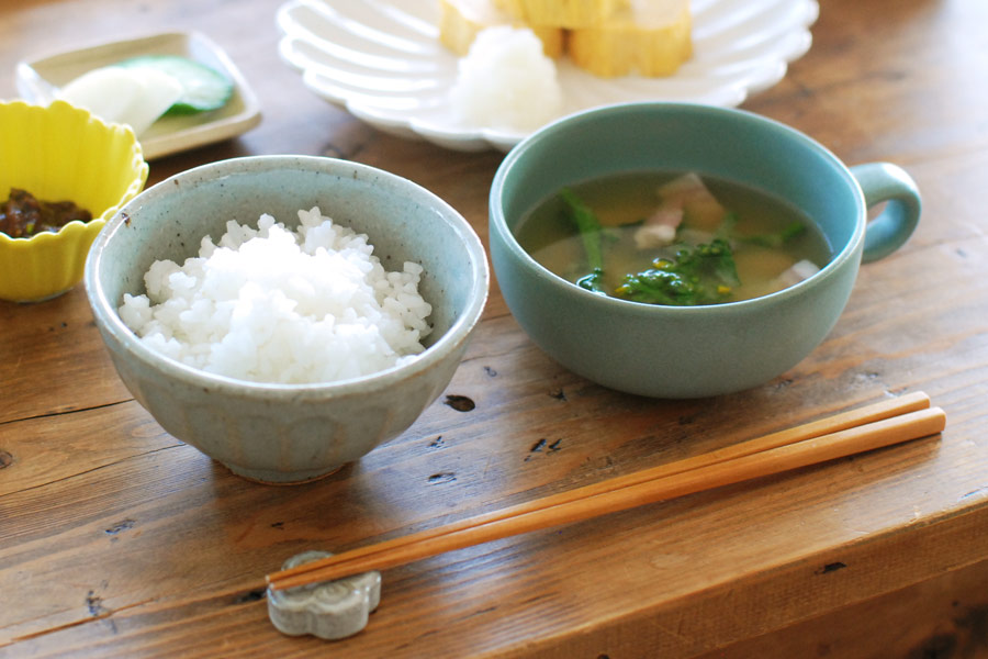 丸みのある落ち着いた色合いのスープカップはお味噌汁を盛りつけても。