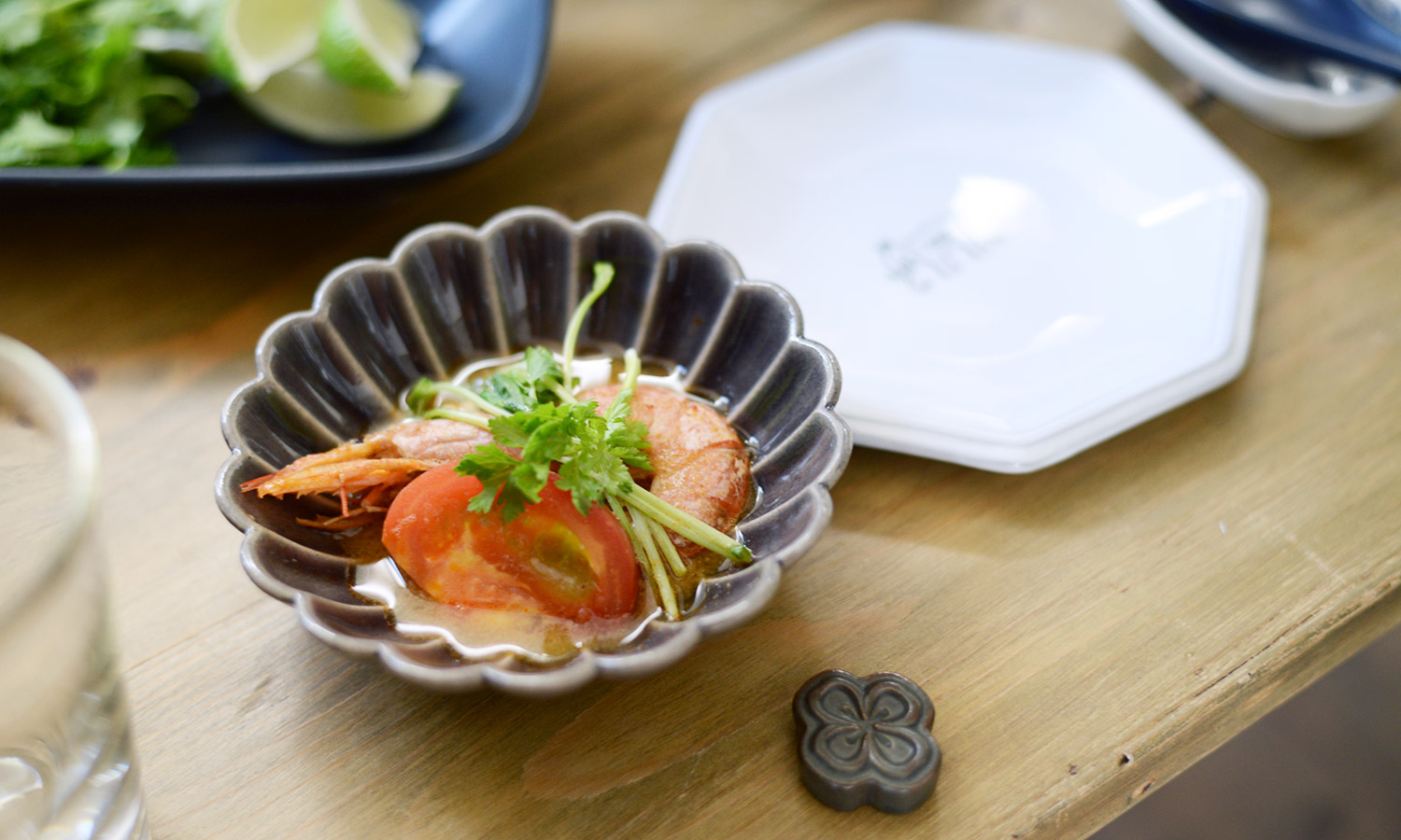 濃淡のある落ち着いた紫の器に、トムヤム鍋の赤や緑の食材がよく映えます。
