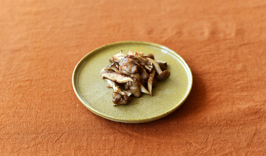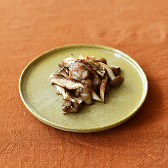 秋らしい渋い色のプレートにきのこのソテーをもりつけました。