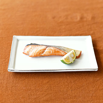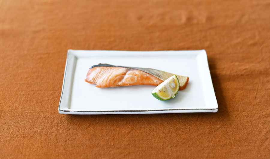 しょうゆとみりんに漬け込み、シンプルに焼いた秋鮭を粉引の焼物皿に。