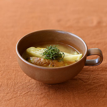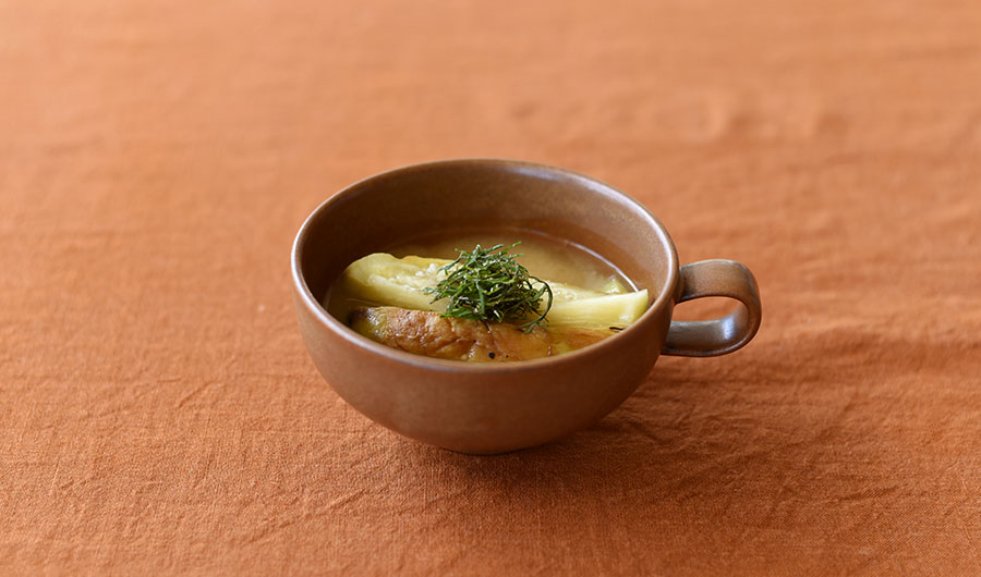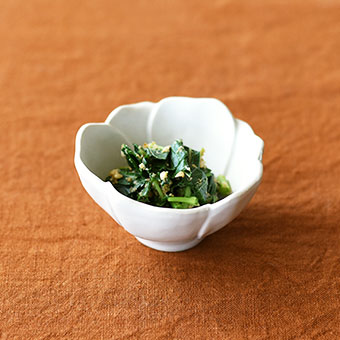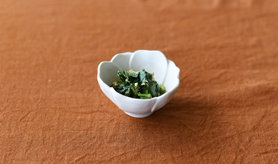 生姜をきかせたモロヘイヤのごま和えを、サザンカをモチーフにした小付によそって。