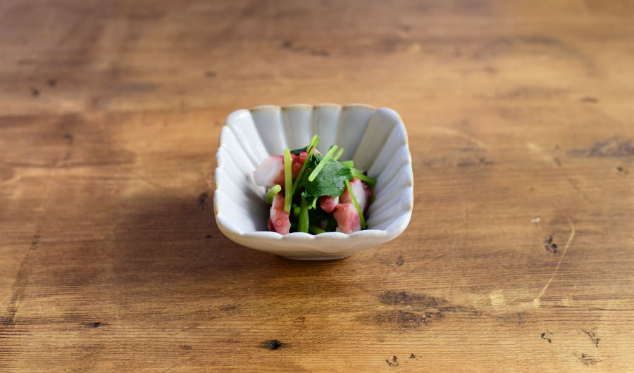 たこと三つ葉に、柚子こしょうをアクセントに加えた和え物。