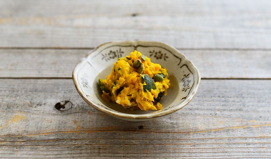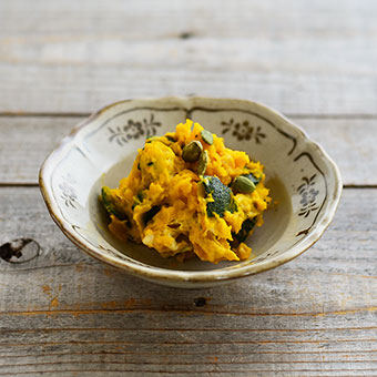 皮付きのかぼちゃを粗くつぶして作ったかぼちゃのサラダ。