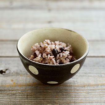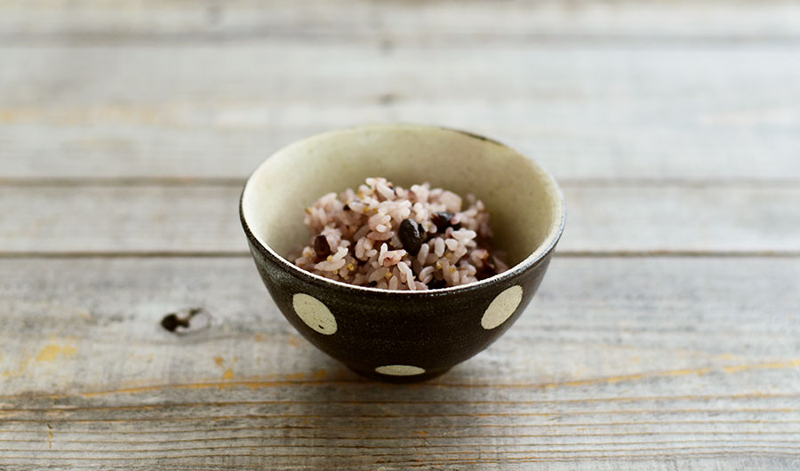 黒米入りの雑穀ごはんを盛りつけたのは、落ち着いた印象の水玉柄の飯碗。