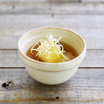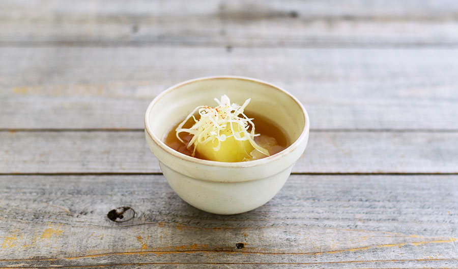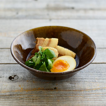 豚の角煮は、瑞々しい透明感のあるアメ色の鉢に盛りつけて。