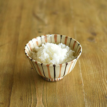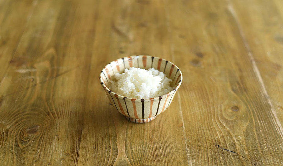 土鍋で炊いたツヤツヤの新米をよそったのは、麦藁手飯碗。