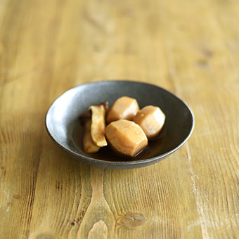 甘辛く煮た里芋とエリンギの煮物はダークグレーの浅鉢に。