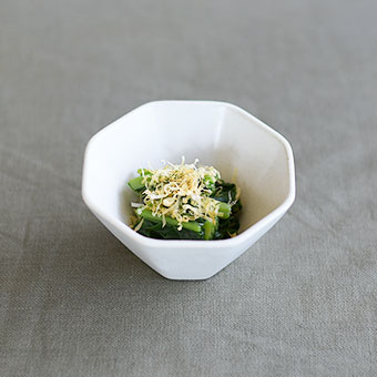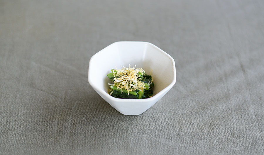 ツルムラサキはお浸しにして、マットな質感の小鉢に盛りつけました。