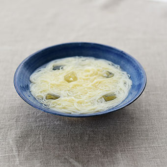 藍染付けの鉢に盛りつけられた素麺が、目にも涼やか。