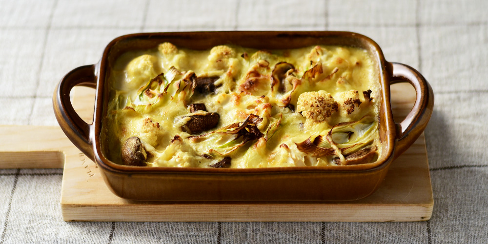 白いグラタンの色合いをカラメル色の器がやさしく引き立てます。
