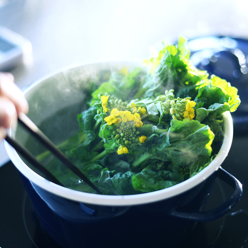 さっと塩ゆでした菜の花を、焼いた油揚げと共に溶き辛子を加えた