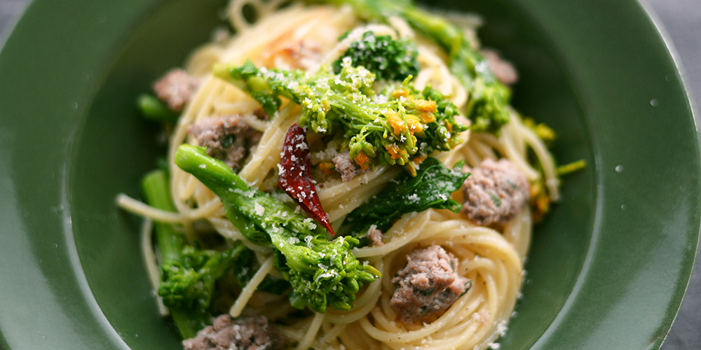 フェンネルやセージを加えたサルシッチャを菜の花に合わせた、香りの良いパスタ。