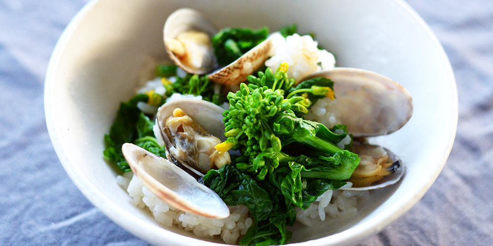あさりを殻つきのまま炊き込み、茹でた菜の花と混ぜ合わせたごはん。