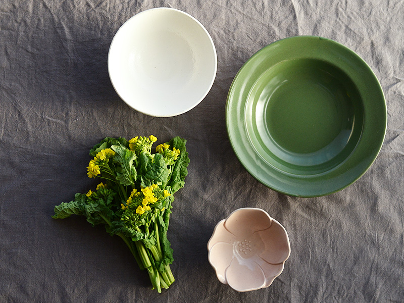 芽吹きの季節をイメージして深みのあるグリーンの深皿に盛りつけました。