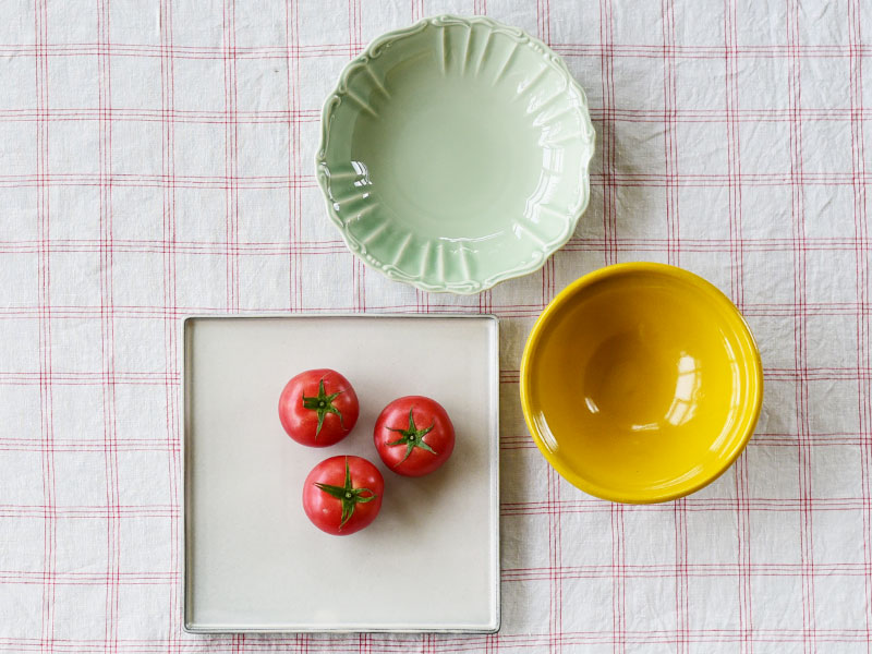奥行きのある黄色の器が夏野菜をいっそう元気に引き立て