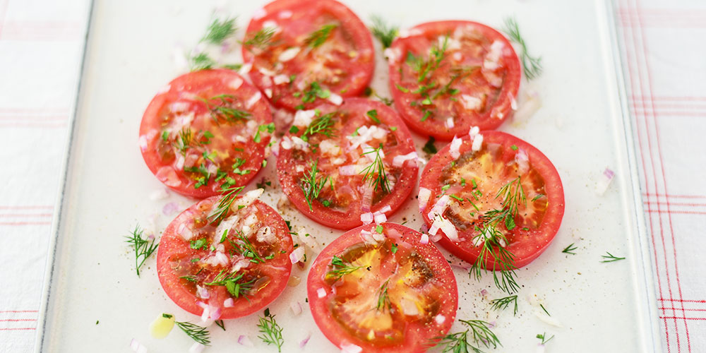 厚めに切ったトマトを並べて、刻んだ玉ねぎやハーブをたっぷり散らします。