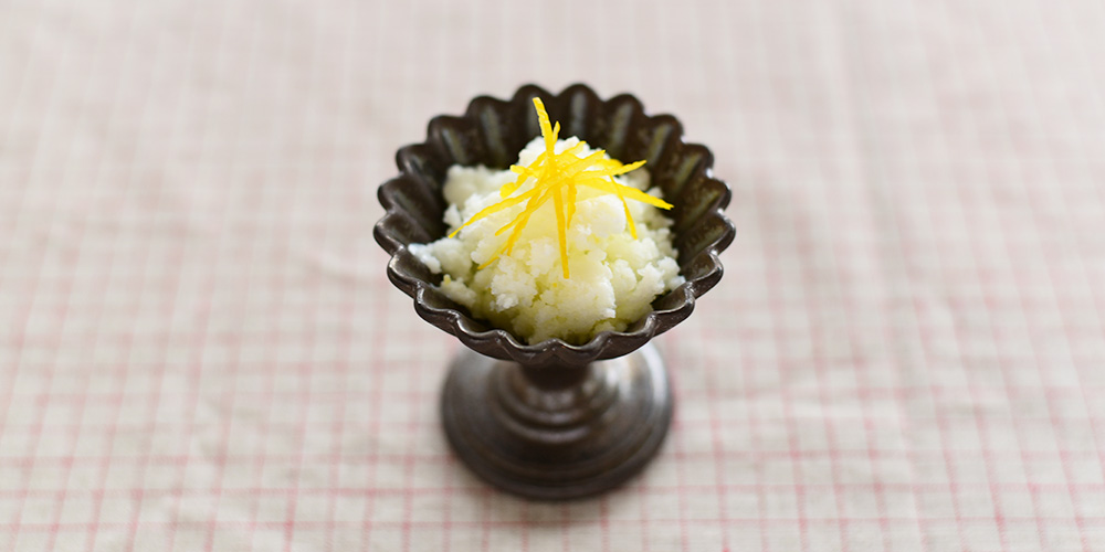 温かい鍋料理などの口直しに最適な、ゆずのグラニテ。 手軽に作れるデザートも、高台のある華やかなプチカップを使うだけで豪華な雰囲気に。 ビンテージ感のある素材感がデザートの色や瑞々しさを引き立てます。