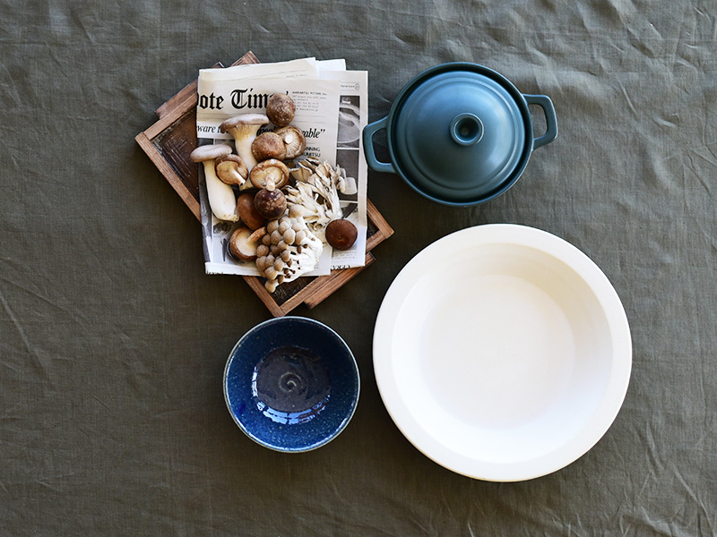 モスグリーンの色合いが新鮮な1人用の小鍋を使って作りました。