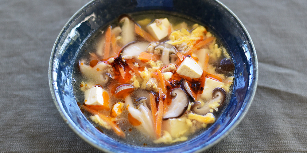 黒酢の酸味と辛味のきいた具だくさんのスープ。