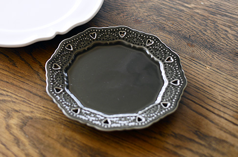 縁取りにポイントのあるものを選ぶとケーキが華やかに見えます。 器の装飾を生かすために盛りつけはシンプルに。